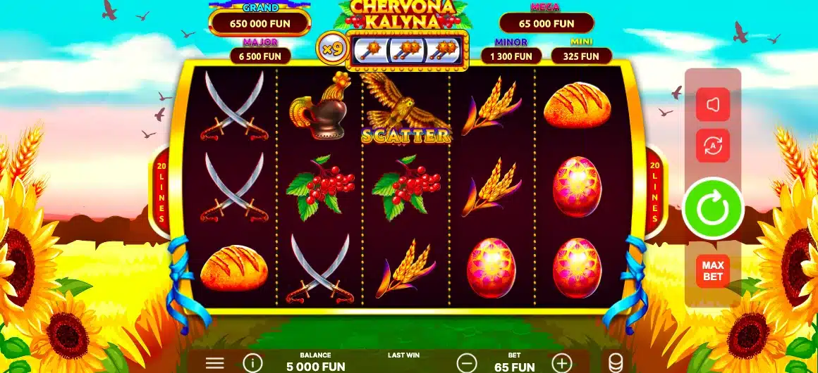 Слот Chervona Kalyna розроблений українським провайдером OnlyPlay і випущений 19 травня 2022 року. Тематика гри повністю присвячена українській культурі та фольклору. Назва “Chervona Kalyna” натхненна легендарною українською патріотичною піснею “Ой у лузі червона калина”, що згодом стала гімном Українських Січових Стрільців. Візуальне оформлення занурює гравців у яскраве поле соняшників та золотої пшениці, створюючи атмосферу українського літа. Фонова музика виконана на народній флейті, що додає автентичності. Символи включають традиційні українські елементи: калину, козацькі шаблі, писанки, пшеницю, хліб, півня та українську дівчину в національному вбранні. OnlyPlay свідомо уникнув стандартних карточних символів, зосередившись виключно на українських культурних елементах.