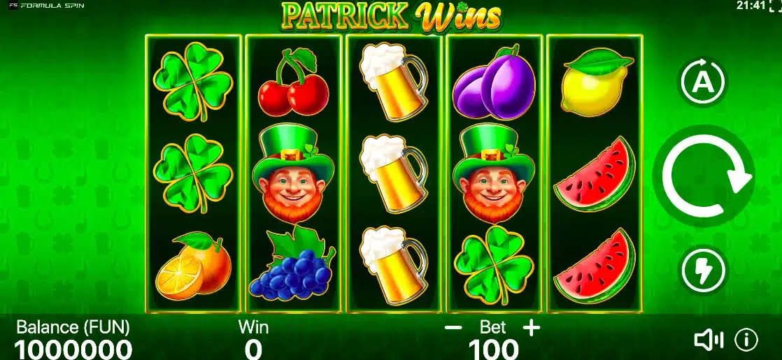 Ігровий автомат Patrick Wins розроблений компанією Formula Spin з яскравою ірландською тематикою, присвяченою Дню Святого Патрика. Гра поєднує класичні ірландські символи з фруктовою машиною – веселий лепрекон у зеленому капелюсі виступає як SCATTER-символ, а чотирилисна конюшина стає WILD-символом. Тематичне оформлення включає традиційні кухлі пива, зелений фон та святкову атмосферу ірландського фольклору.