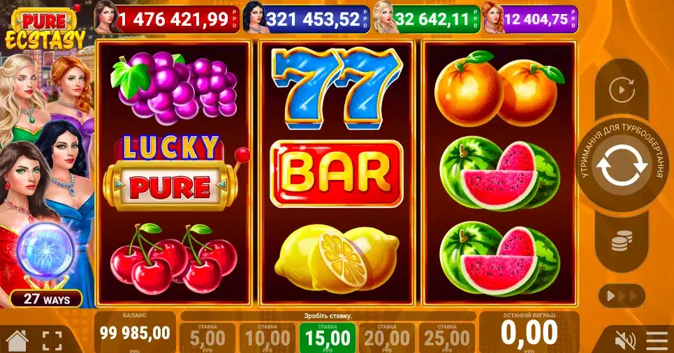 Ігровий класичний слот Pure Ecstasy від провайдера Pateplay із 3 барабанами і 3 рядами, що пропонує гравцям 27 виграшних ліній. Механіка гри базується на утворенні комбінацій із трьох однакових символів, які розташовані послідовно, починаючи з крайнього лівого барабана, без необхідності точного попадання в один рядок. Важливими елементами є спеціальні символи, серед яких діамантовий Wild, що замінює інші символи для формування виграшних комбінацій, і Scatter, який запускає бонусну функцію Lucky Pure з множниками виграшів до х100. У грі також реалізована функція багаторівневого Regal Jackpot із чотирма рівнями, які активуються випадковим чином після завершення основної гри. Додатково гравцю доступний режим “Гра на ризик”, де можна подвоїти виграш, вгадавши колір карти. Слот Pure Ecstasy є доволі популярним серед гравців та представлений на багатьох провідних платформах. Можна легко знайти цей автомат та грати в ігри на гроші з реальними виграшами.