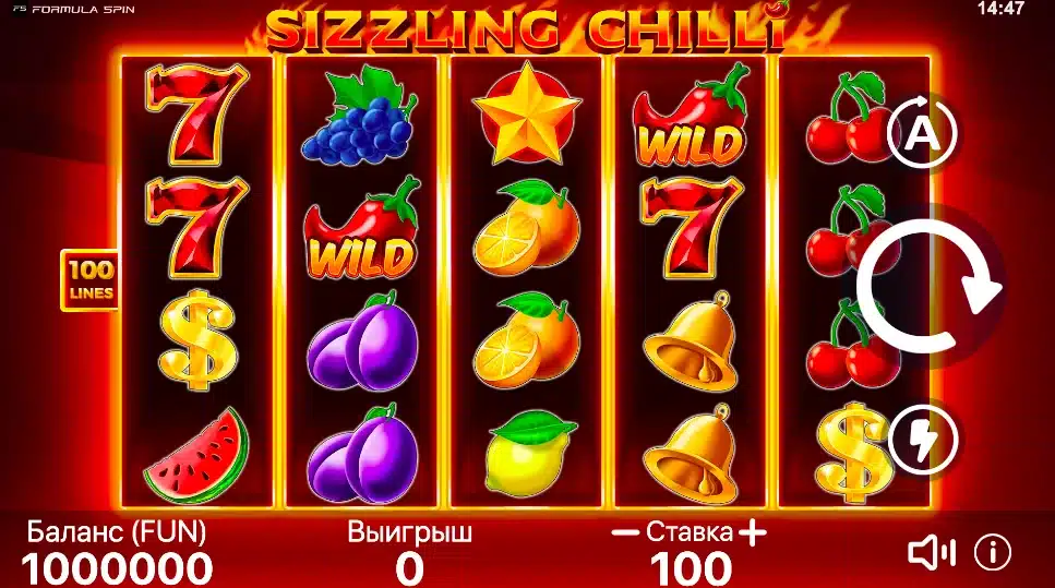 Відеослот Sizzling Chilli від перспективного провайдера Formula Spin, який майстерно поєднує класичну фруктову тематику з інноваційними ігровими механіками та гострими чилі для додання особливої пікантності. Випущений 14 травня 2025 року, сітка 5×4 з 100 фіксованими лініями виплат та RTP 96.2%, розширювані Wild-символи чилі, революційну систему Stacked символів. Середня волатильність. Завдяки максимальному потенціалу виграшу понад 3,000x від ставки та двом типам Scatter-символів, що можуть принести до 10,000 кредитів, кожне обертання барабанів обіцяє гостру пригоду з можливістю солідних виплат.
